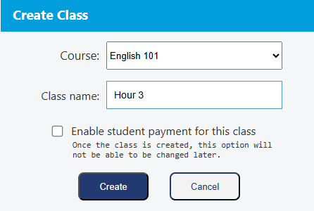 Before creating a class, you must first select a course from the drop-down Select Course menu. When you are creating your first class, you will also need to create the corresponding course.